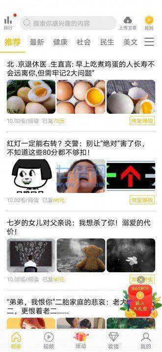 2、软件上提供了新闻、美食、健康、养生等资讯文章,正规绿色,转发至微信,好友点击就挣钱;